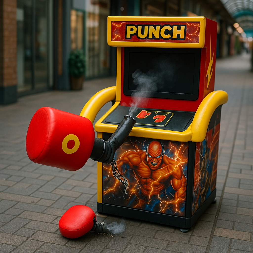 パンチングマシーンって、普通は「壊れない」から成り立つものですよね。それを壊すって、強さのアピール以前にパンチングマシーンのルールを破る感じがあって痺れます!