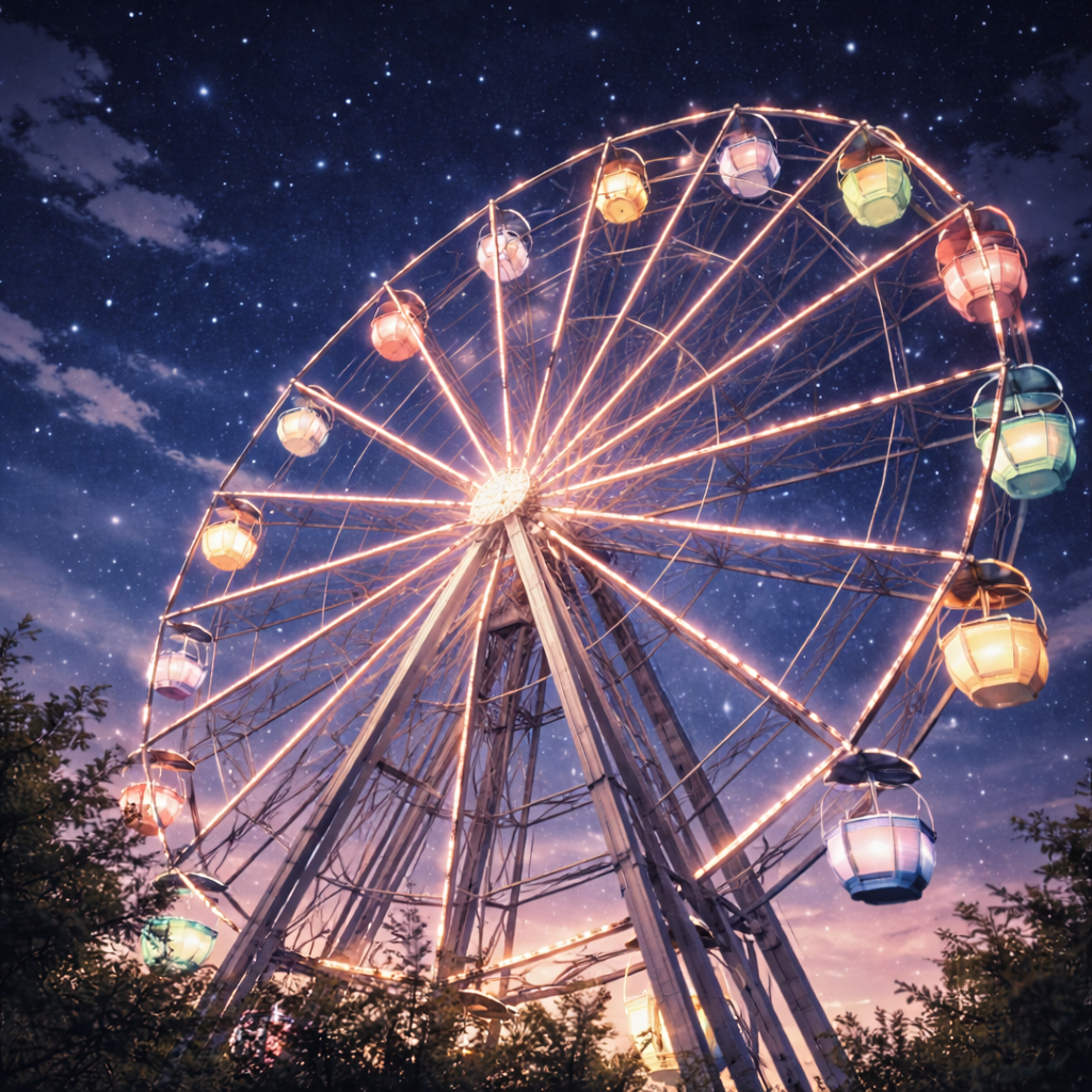 その中でどれか1つだけ乗ろうとシルビアが提案します。その案にヨシテル少し灯す観覧車へ目線を向けます。